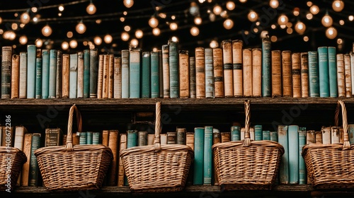 Obraz premium Books sit above woven baskets under string lights, casting a warm glow