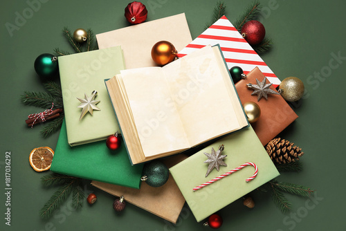 © Pixel-Shot, Naklejka premium Books with Christmas balls, candy cane and fir branches on green background