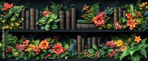 Fototapeta premium Bookshelves covered with foliage and vibrant flowers creating an interesting,...