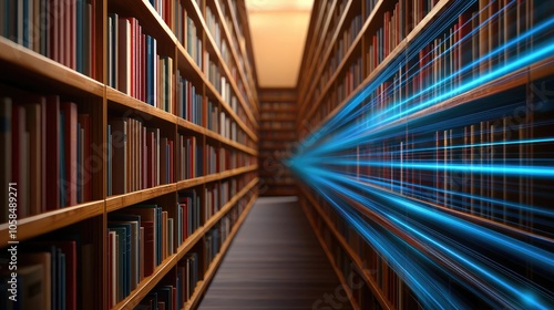 Fototapeta premium Bookshelves with blue light effect in a library setting.