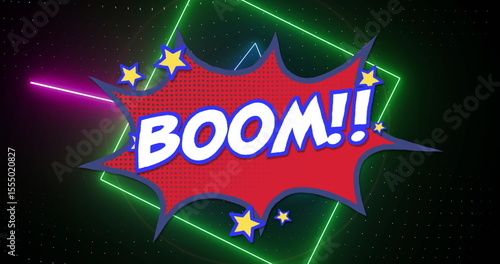Fototapeta premium BOOM!! image with stars over colorful neon shapes and dots in school