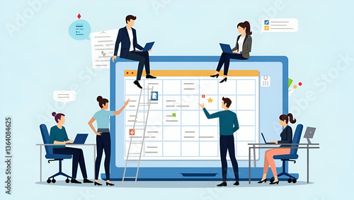© Netaya, Fototapeta premium Boost Your Business Productivity: Flat Vector Illustration of a Team Collaborating on Digital Calendar Planning - Perfect for Stock Photo Concepts with Space for Customization