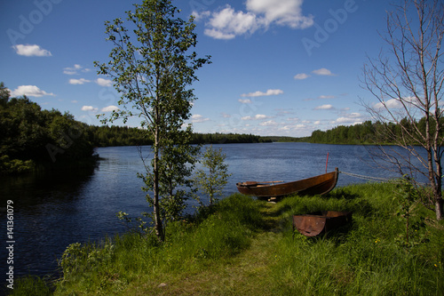 Fototapeta premium Boot am Fluss in Finnland in der Mittsommer-Sonne