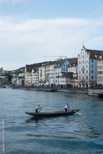 © Simon, Obraz premium Boot auf Limmat in Zürich mit Altstadt im Hintergrund