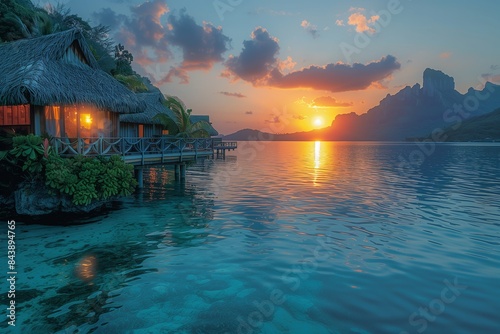 Fototapeta premium Bora Bora Sunset: Mesmerizing Evening Sky Over Tropical Paradise.