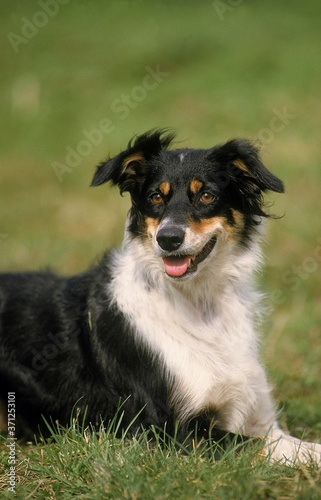 © slowmotiongli, Fototapeta premium Border Collie Dog laying on Grass
