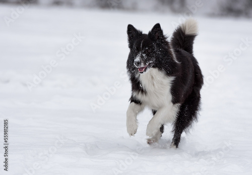 © Mindaugas Dulinskas, Naklejka premium Border Collie Dog Running on Snow. Winter and Snowy Background.