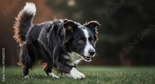 Fototapeta premium Border collie dog walking on the grass in a park on a sunny day