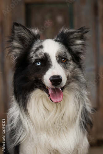© DoraZett, Fototapeta premium Border collie dog with wooden background
