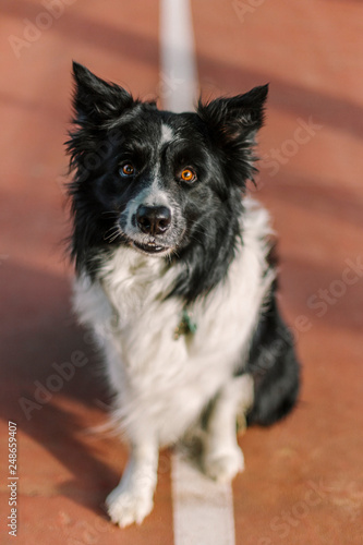 © Estrella Andrade, Fototapeta premium Border collie in a brown orange tennis court