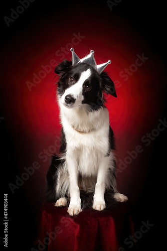© Maxim Kukurund, Fototapeta premium Border collie with crown on head. Qween, winner, champion dog. Red background.