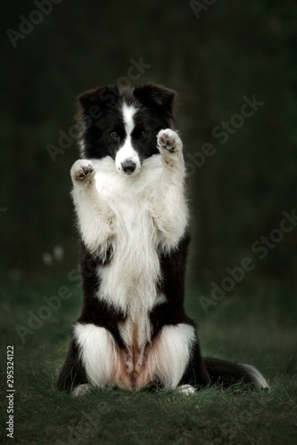© Kseniya, Fototapeta premium Border Collies like as bunny in the dark forest