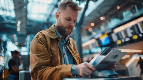 © 楠 刘, Fototapeta premium Border control officer scanning passport with electronic reader at airport security checkpoint. Traveler waiting nervously. Modern terminal interior showcases high-tech security procedures and interna