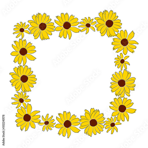 Fototapeta premium Border of open heliopsis blossom vector color illustration isolated on white background. Vector sketch style top view hand drawing of wild, heliopsis, false sunflower.