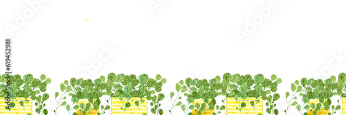 Fototapeta premium border with twigs, ornamental stripe with greenery, wooden crates, wicker basket, glass vase, glass bottle, watercolor hand drawn isolated picture