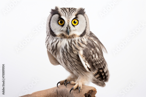 © Laser Eagle, Naklejka premium Boreal Owl standing on a white background. Animal front portrait.