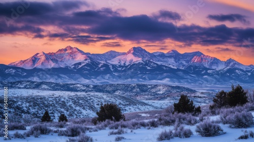 Obraz premium Borealis seen above the Utah mountains in winter covered by snow, with few pines disseminated across the peaks. High-contrast lighting, chiaroscuro, and high definition. cinematic scene