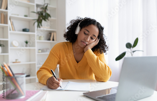© Prostock-studio, Obraz premium Bored young black female student having dull online lesson on laptop computer, writing down information at home
