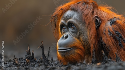 © Lemdah, Fototapeta premium Bornean orangutan resting burnt forest