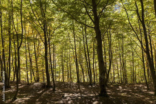 © nnerto, Fototapeta premium Bosco di lecci. Lunghe ombre proiettate a terra.