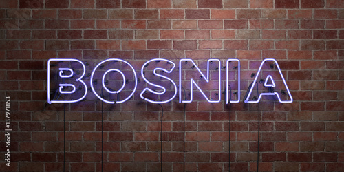 © Chris Titze Imaging, Obraz premium BOSNIA - fluorescent Neon tube Sign on brickwork - Front view - 3D rendered royalty free stock picture. Can be used for online banner ads and direct mailers..