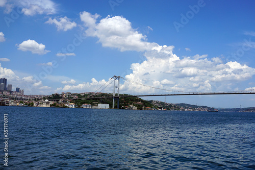 © Volkann, Naklejka premium Bosphorus bridge in Istanbul, blue sky and sea