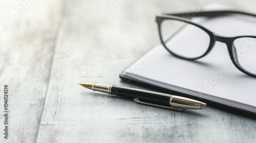 Fototapeta premium Boss Day concept,black pen lies next to an open notepad and reading glasses on a rustic wooden desk,capturing a calm moment of writing or brainstorming ideas,copy space