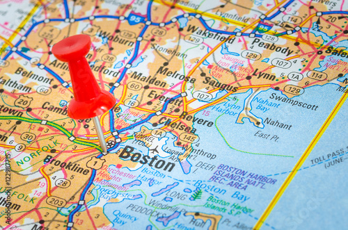 Naklejka premium Boston Highlighted on a Map by a Red Pushpin