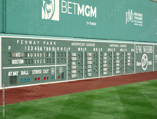 © zimmytws, Fototapeta premium Boston, MA - USA - 08-06-2025: The scoreboard and green monster left field wall at Fenway Park, home of the Boston Red Sox Major League Baseball team