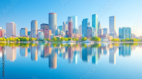 © DIAHIMAGESNEW, Fototapeta premium Boston skyline reflected in calm water at sunrise.