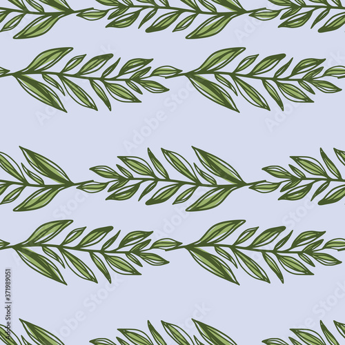 Fototapeta premium Botanic doodle seamless pattern with foliage branches. Blue background with green leaves. Stylized artwork.