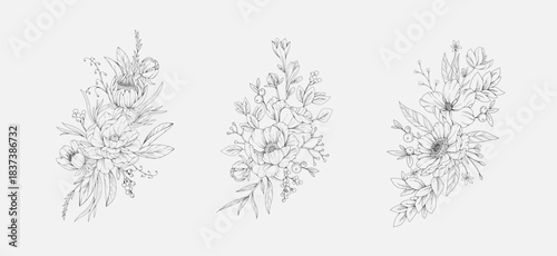 © merfin, Fototapeta premium Botanic set of detailed various flowers and brunch. Luxury vintage floral collection for wedding invitation, wallpaper art or save the date card. Botanical vector illustration