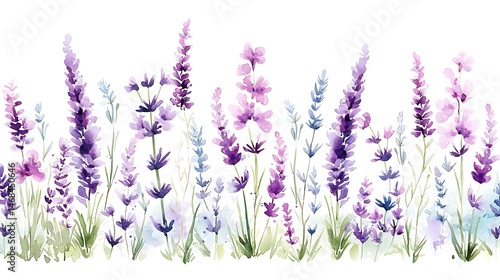 © nilawan, Naklejka premium Botanical art watercolor floral arrangement of purple flowers in a vibrant natural setting