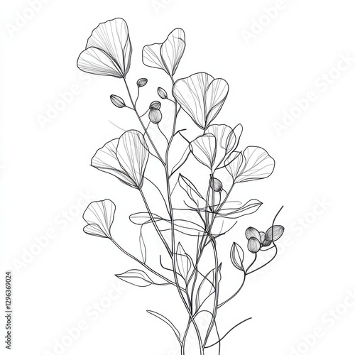 © Johannes, Obraz premium Botanical arts. Hand drawn continuous line drawing of herbs, abstract flower, floral, ginkgo, rose, tulip, bouquet of olives. Vector illustration.