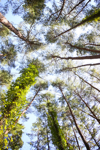 © pulia, Obraz premium botanical background of green forest and blue sky