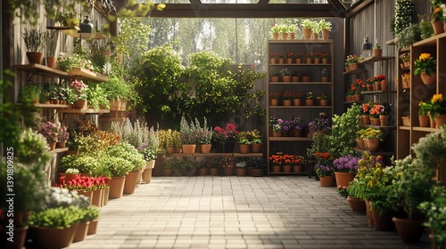 © Gedel, Fototapeta premium Botanical bliss: A Serene Greenhouse Filled with Potted Flowers and Plants