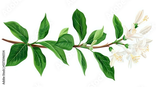 © Yuliia, Fototapeta premium Botanical branch with white jasmine flowers and green leaves on isolated background, floral design element for natural cosmetics packaging and decor.