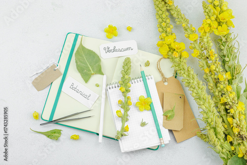 © FuzullHanum, Obraz premium Botanical flat lay with Verbascum flower, leaves, and sketchbook on light background