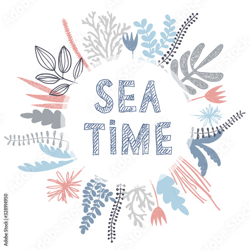 Fototapeta premium Botanical frame from sea plants with Sea time lettering. Perfect for postcard, fasion print, different typografy or invitation.