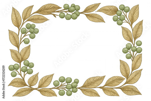 Fototapeta premium Botanical frame with golden leaves and green berries creating a vintage...