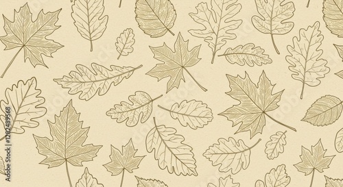 Fototapeta premium Botanical illustration, autumn leaves, hand-drawn style, sepia tones, repetitive pattern, oak leaves, maple leaves, vintage aesthetic, nature sketch, beige background, delicate line work, scientific i