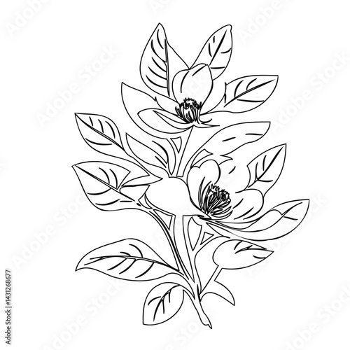 © Rahma, Fototapeta premium Botanical illustration of magnolia blossom with delicate line art for print design