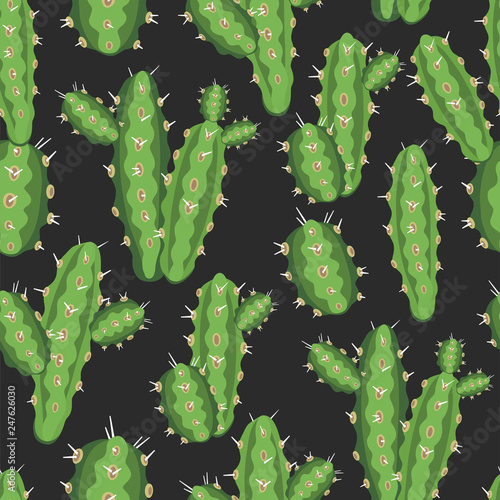© monamonash, Naklejka premium botanical illustration with Peruvian cactus. Vector seamless pattern on black background. Summer plants.