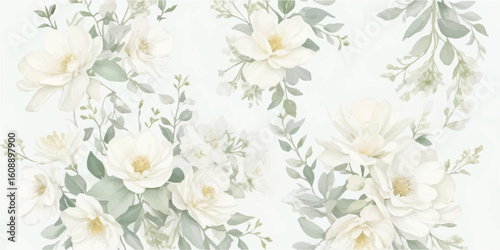 © Muhammad, Fototapeta premium Botanical Watercolor Flower Clipart Pack with Butter Yellow Blooms, Dusty Blue and Sage Leaves, and Ivory White Flowers Isolated on Transparent