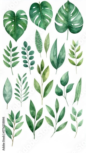 Fototapeta premium Botanical Watercolor Study: A collection of meticulously painted, vibrant green leaves bursts with life. Capturing the fresh and inviting details of botanical art.