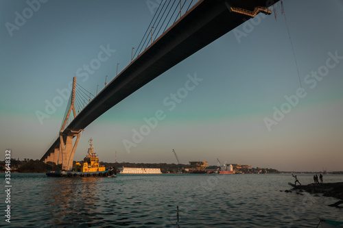 © Diego, Fototapeta premium botes de pesca en el rio bajo un puente fishing boats on the river under a bridge
