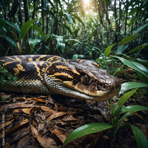 Fototapeta premium Bothrops Alcatraz Slithering Through Underbrush in Dynamic Wildlife Action...