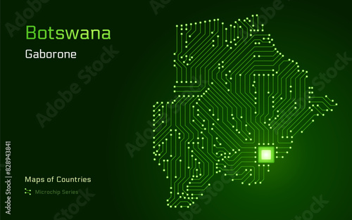 © Владимир Тюрин, Naklejka premium Botswana Map with a capital of Gaborone Shown in a Microchip Pattern with processor. E-government. World Countries vector maps. Microchip Series