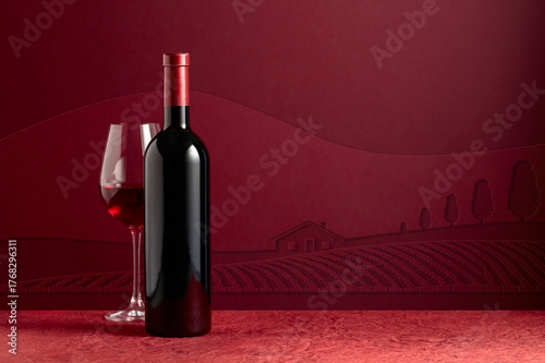© Igor Normann, Obraz premium Bottle and glass of red wine on a red background.