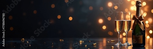 © Vadym, Obraz premium Bottle of champagne with two glasses awaits celebration. Bubbles rise in flutes, golden ribbon adorns bottle. Festive bokeh lights create atmosphere of luxury, joy, happy new year, and special events.